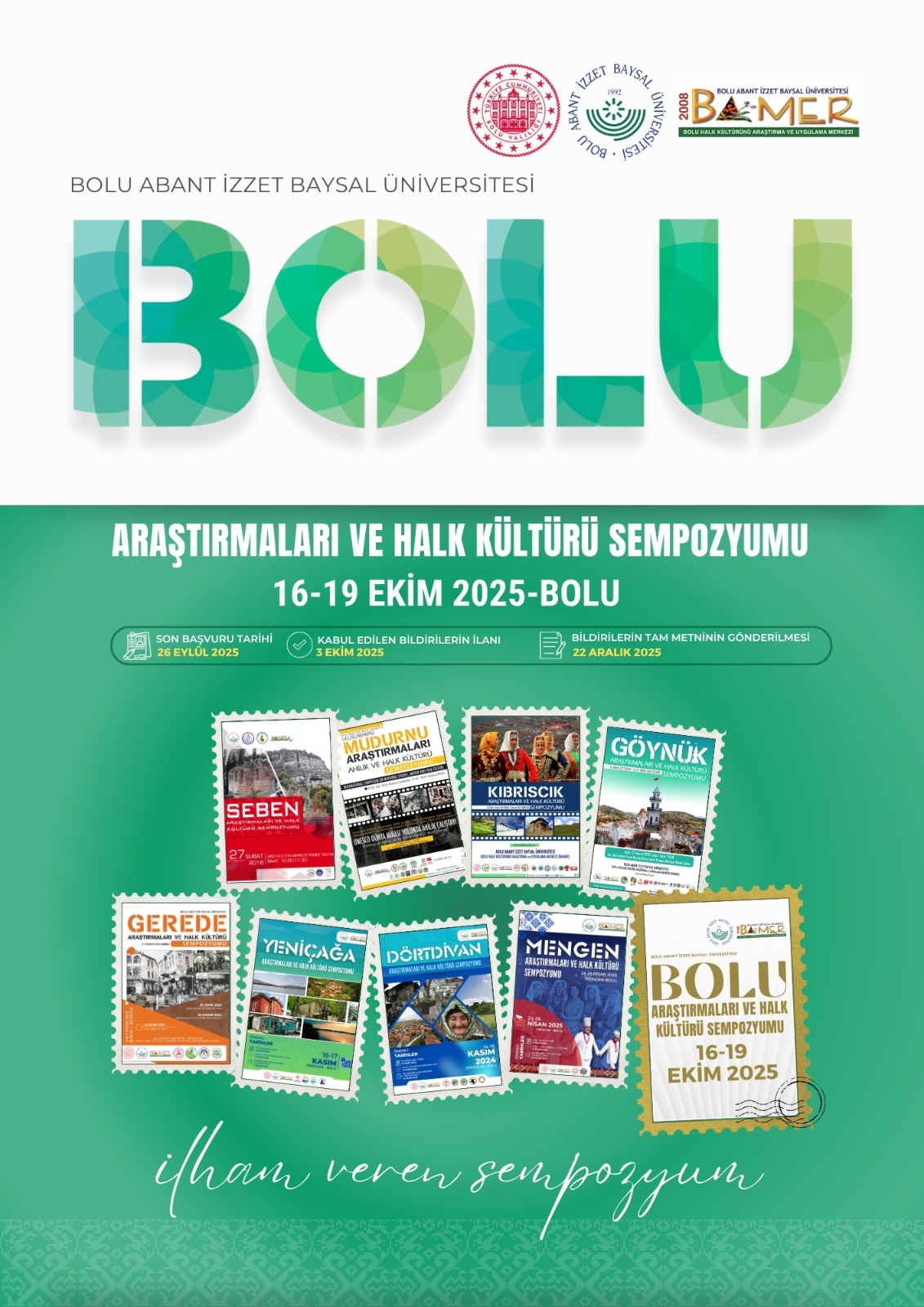 Bolu Abant İzzet Baysal Üniversitesi Rektörlüğü ve Bolu Valiliği öncülüğünde, Bolu Abant İzzet Baysal Üniversitesi Bolu Halk Kültürünü Uygulama ve Araştırma Merkezi Müdürlüğü (BAMER) ve ilgili kurumların iş birliğiyle gerçekleştirilecek olan Bolu Araştırmaları ve Halk Kültürü Sempozyumu, 16-19 Ekim 2025 tarihleri arasında Bolu il merkezinde düzenlenecektir. Bolu’nun tarihî ve kültürel mirasını, doğal zenginliklerini, sosyo-ekonomik yapısını ve toplumsal gelişimini çok yönlü biçimde ele almak, bu alanlarda yapılmış akademik çalışmaları paylaşmak ve yeni araştırmalara zemin hazırlamak amacıyla gerçekleştirilecek sempozyumda aşağıdaki başlıca temalar çerçevesinde bildiriler sunulması beklenmektedir: